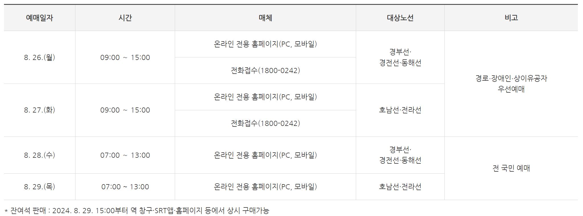 ▶ 만약 예매에 실패한 경우 2024년 8월 29일(목) 15시부터 역 창구, SRT 홈페이지, 모바일앱(SRT)에서 상시발매 예정이니 수시로 잔여좌석 현황 확인